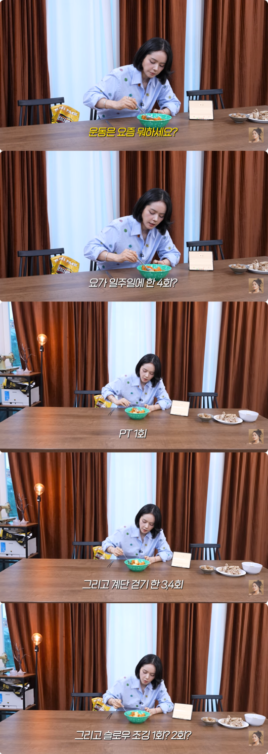 한가인은 "요가 일주일에 한 4회, PT 1회, 그리고 계단 걷기 한 3, 4회, 그리고 슬로우 조깅 1회나 2회"라며 입이 다물어지지 않는 엄청난 운동량을 줄줄이 나열했다. 주중 거의 매일, 여러 종류의 운동을 병행하는 그녀의 루틴은 철저한 자기관리의 정수를 보여주었다.