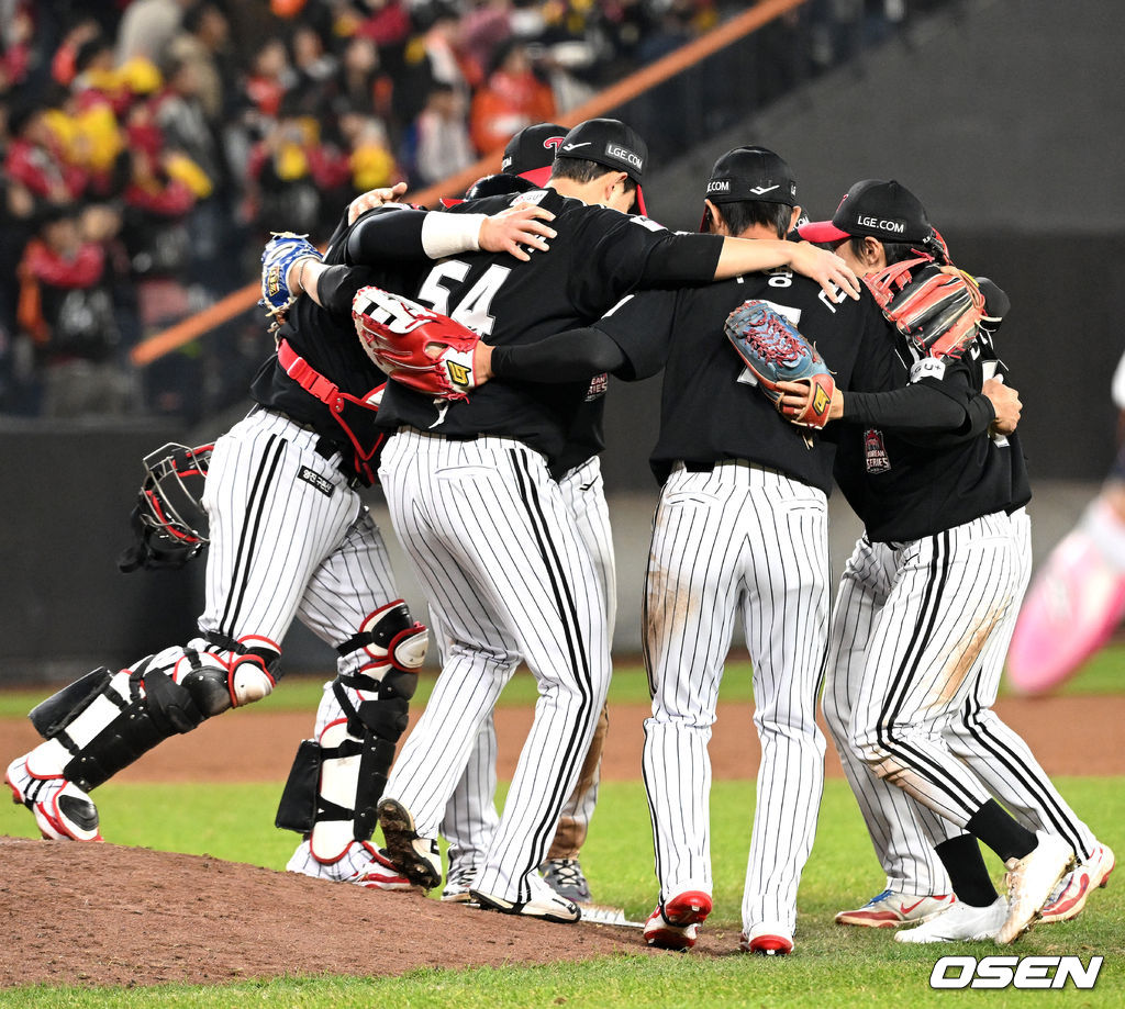 경기 종료 후 LG 선수들이 승리의 기쁨을 나누고 있다. 2025.10.30 /sunday@osen.co.kr
