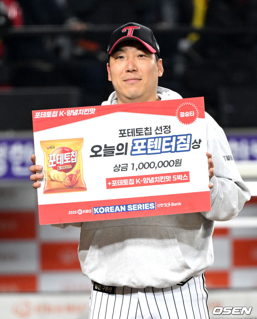 경기 종료 후 오늘의 포텐터짐상을 받은 LG 김현수가 포즈를 취하고 있다. 2025.10.30 /sunday@osen.co.kr