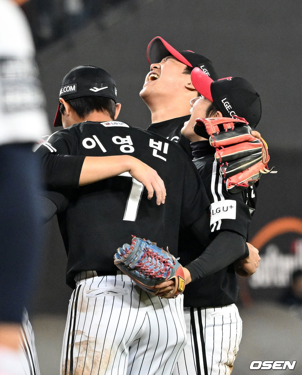 경기 종료 후 LG 문보경이 동료들과 환호하고 있다. 2025.10.30 /sunday@osen.co.kr