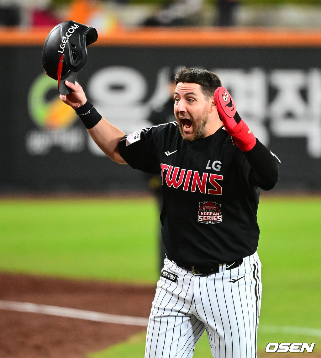 9회초 공격을 마치고 적시타를 날린 LG 오스틴이 기뻐하고 있다. 2025.10.30 /jpnews@osen.co.kr