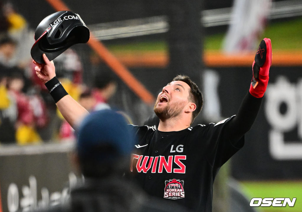 9회초 공격을 마치고 적시타를 날린 LG 오스틴이 기뻐하고 있다. 2025.10.30 /jpnews@osen.co.kr