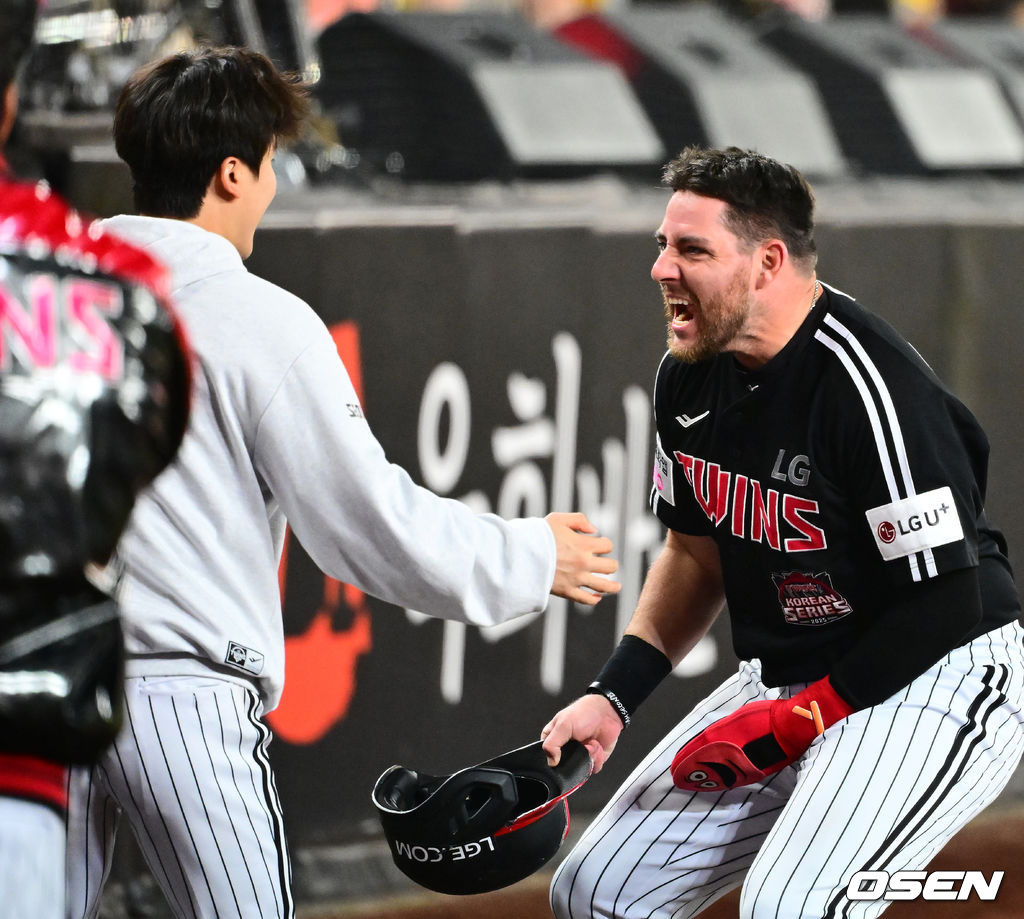 9회초 공격을 마치고 적시타를 날린 LG 오스틴이 기뻐하고 있다. 2025.10.30 /jpnews@osen.co.kr