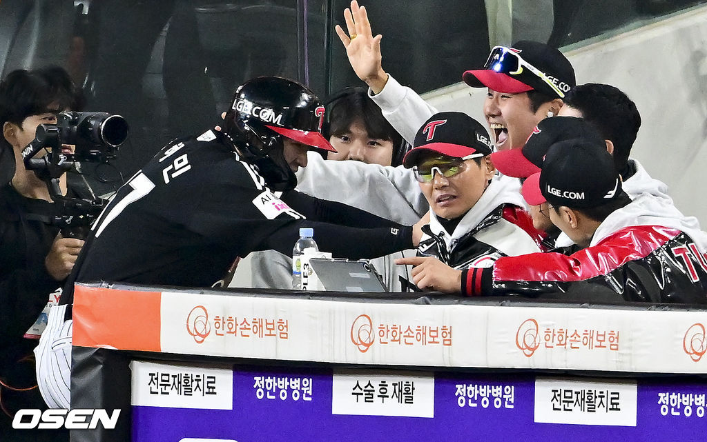 9회초 2사 2,3루 LG 김현수의 역전 2타점 적시타때 박해민이 득점 후 염경엽 감독을 흔들고 있다. 2025.10.30 / soul1014@osen.co.kr