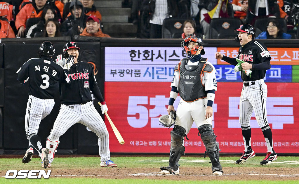 9회초 2사 2,3루 LG 김현수의 역전 2타점 적시타때 홈을 밟은 최원영과 박해민이 득점 후 기뻐하고 있다. 2025.10.30 / soul1014@osen.co.kr