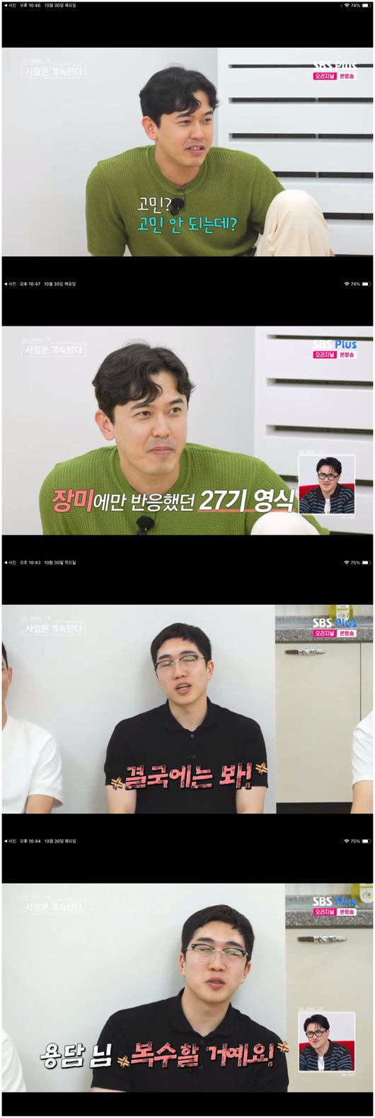 30일 방영한 ENA, SBS Plus 예능 ‘나는 SOLO, 그 후 사랑은 계속된다’(이하 ‘나솔사계’)에서는 이미 '나는 솔로'를 통해 한 번 정도 공개됐던 남성 출연자들 중 27기 영식이 최다 득표를 받았다.