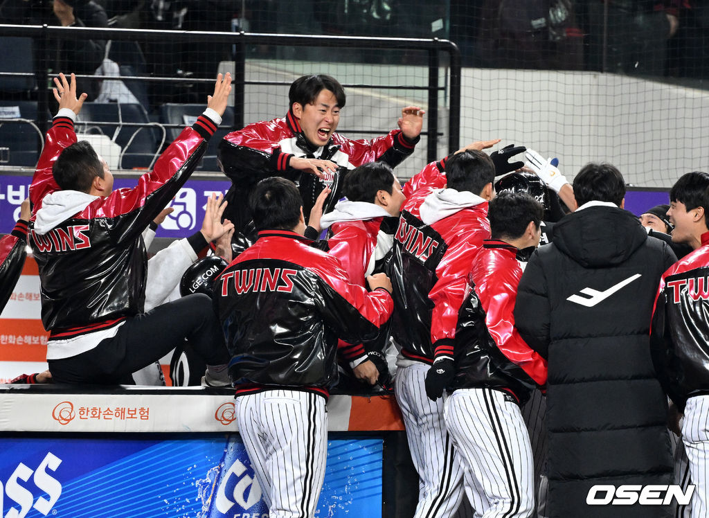 9회초 2사 2,3루에서 LG 김현수가 우전 적시 2루타를 치고 대주자와 교체되며 환호하고 있다. 2025.10.30 /sunday@osen.co.kr