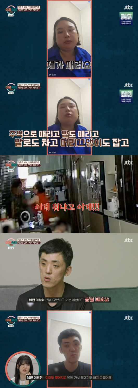 아내는 자신이 남편을 폭행한다는 사실을 인정하며, 그 폭력의 정도를 직접 설명해 스튜디오를 경악하게 만들었다. 아내는 "주먹으로 때리고 뺨도 때리고 발로도 차고 머리끄댕이도 잡는다"고 상세히 밝혀 상습적이고 무자비한 폭행이 일상이었음을 시사했다.