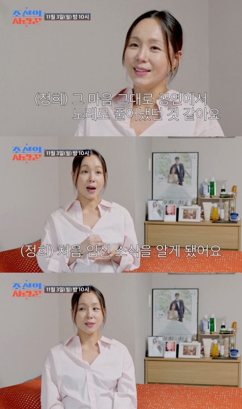 11월 3일(월) 방송될 ‘조선의 사랑꾼’ 선공개 영상에서 임정희는 "결혼하고 두 달 정도 됐을 때 처음 임신 소식을 알게 됐다"며 이야기를 시작했다. 그는 "그때는 준비가 안 되어 있어서 못 느꼈던 것 같다. 초반에 유산하게 됐는데, 그때 공연을 하고 있어서 알고도 병원에서 수술을 못하고 공연에 나섰다"면서 결혼 초, 갑작스럽게 알게 된 임신과 돌연 아이를 잃게 된 유산의 아픔을 담담하게 털어놓았다.