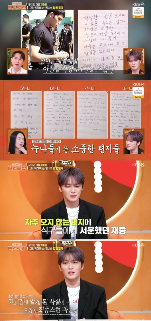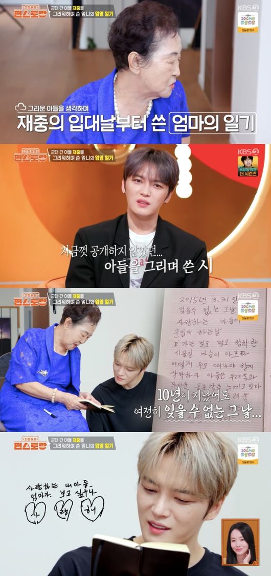 깜짝 놀란 김재중은 “몰랐다. 진짜 늦게 바서 너무 속상했다”라며 “진짜 매일 하루도 빠짐없이 쓰셨더라. 제가 서른 살에 군대를 갔는데 엄마 눈에는 세 살 아기로 보이시는 것 같다”라고 전했다.