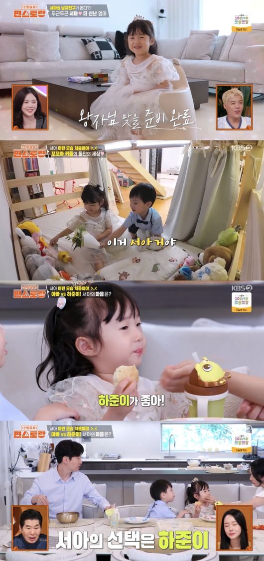 특히 서아는 아빠에게 하준이가 준 꽃다발을 자랑하며 “결혼할까? 하준이랑 결혼할까?”라고 고백해 모두를 놀라게 했다. 그 말에 하준이는 서아를 쫓아갔고, 두 아이들은 소꿉놀이를 하며 즐거운 시간을 보냈다.