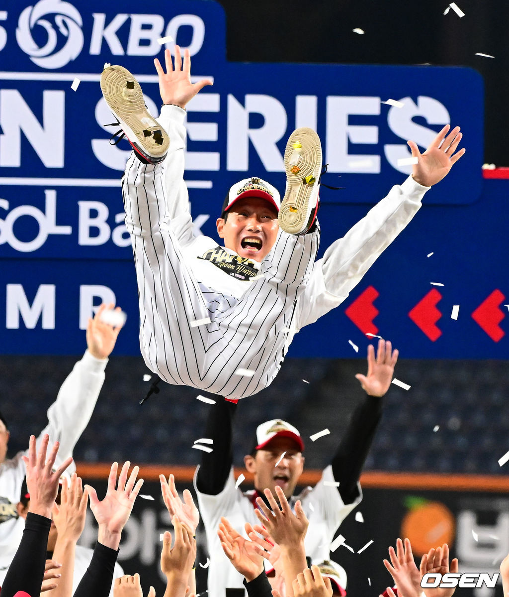 LG 염경엽 감독이 헹가래를 받으며 기뻐하고 있다. 2025.10.31 /jpnews@osen.co.kr