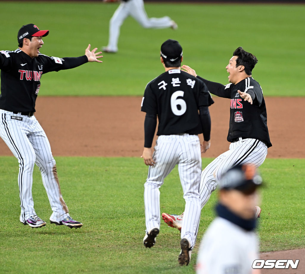 LG 오지환과 문보경이 환호하고 있다. 2025.10.31/spjj@osen.co.kr