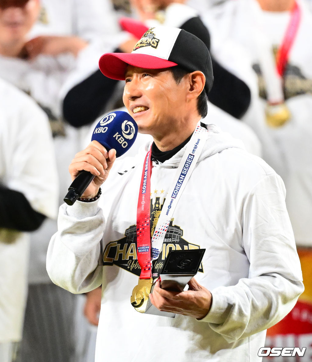 LG 염경엽 감독이 우승 감독상을 수상하며 팬들에게 인사를 전하고 있다. 2025.10.31 /jpnews@osen.co.kr