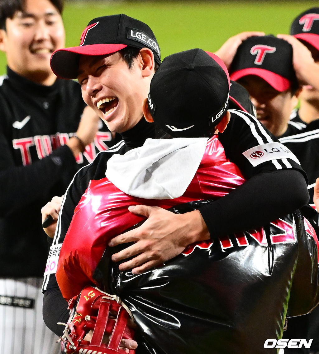 LG 염경엽 감독이 홍창기와 우승을 기뻐하고 있다. 2025.10.31 /jpnews@osen.co.kr