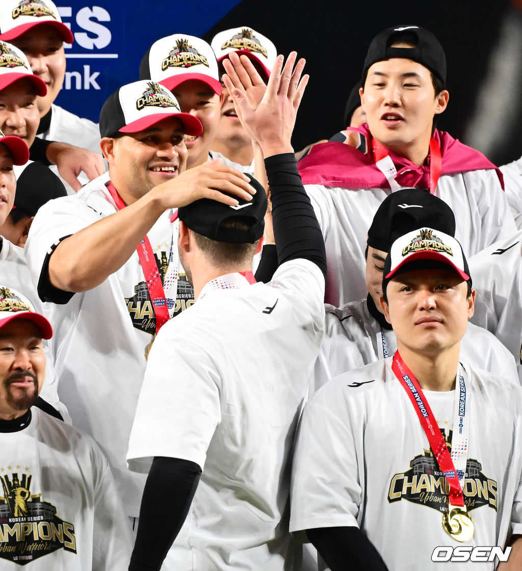 LG 톨허스트가 치리노스, 임찬규와 우승을 기뻐하고 있다. 2025.10.31 /jpnews@osen.co.kr