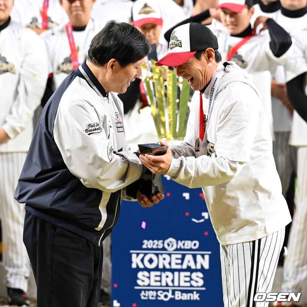 허구연 총재가 LG 염경엽 감독에게 우승 감독상 트로피를 건네고 있다. 2025.10.31 /sunday@osen.co.kr