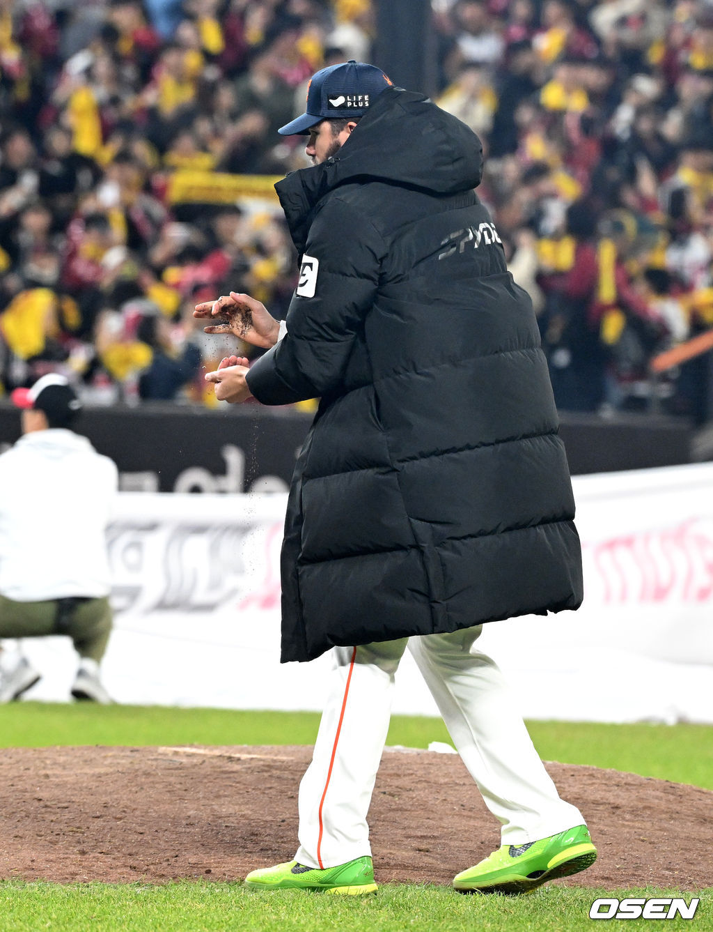 경기 종료 후 한화 폰세가 마운드 흙을 가져가고 있다. 2025.10.31 /sunday@osen.co.kr