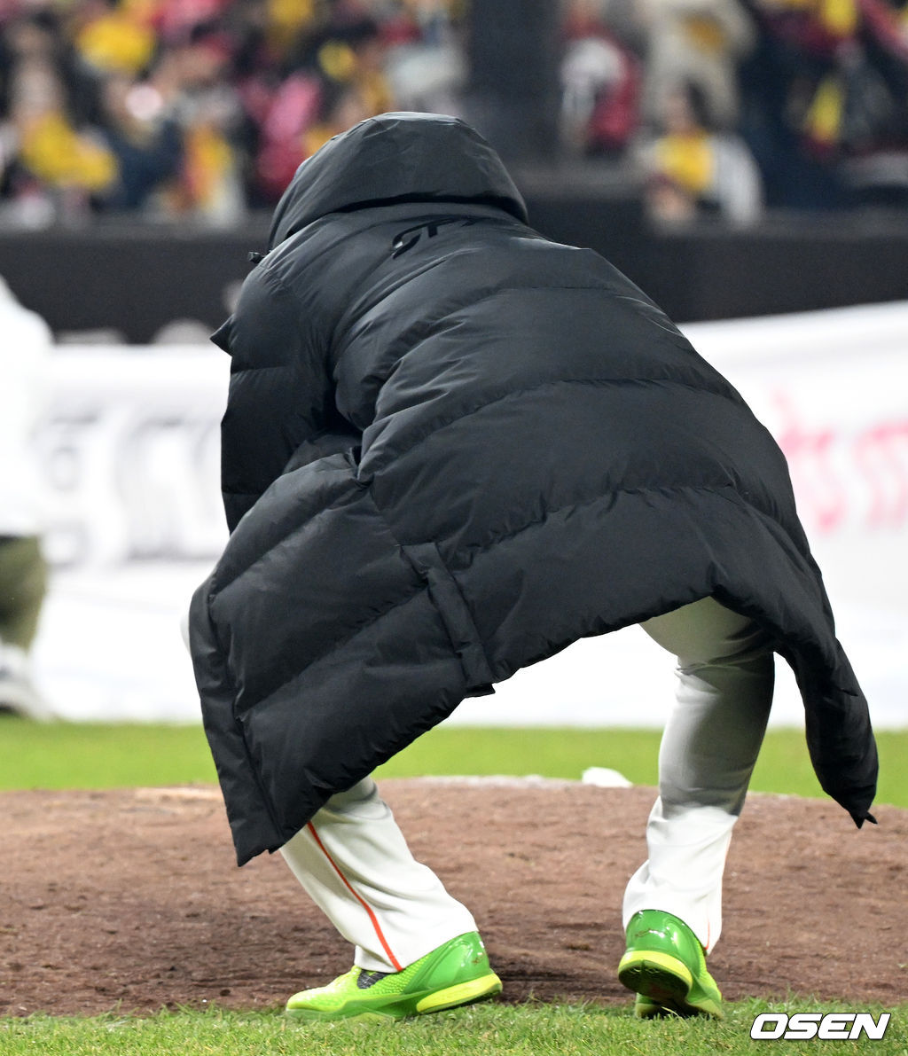 경기 종료 후 한화 폰세가 마운드 흙을 가져가고 있다. 2025.10.31 /sunday@osen.co.kr