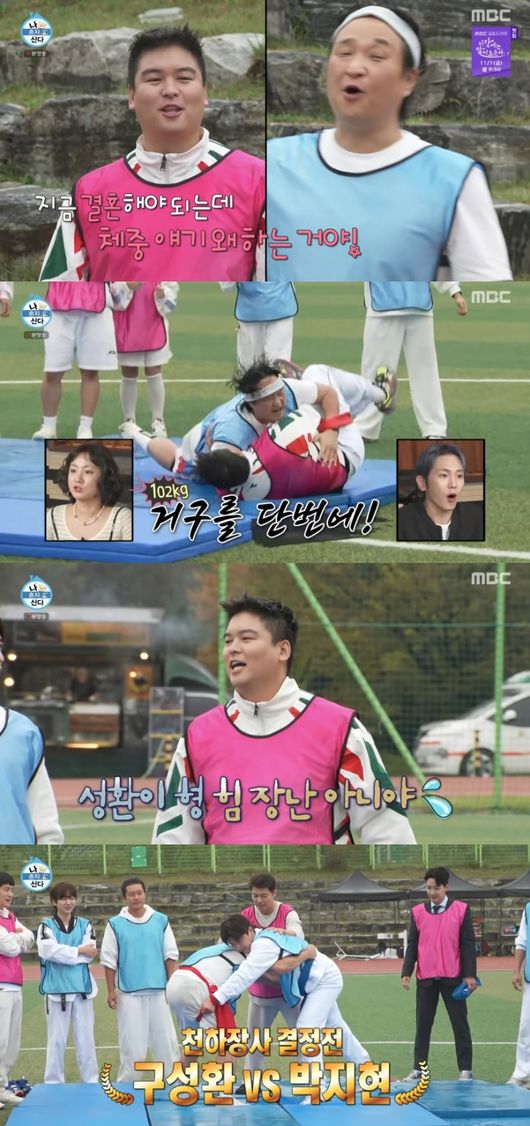 이날 세 번째 스페셜 매치로 씨름을 진행, 구성환과 이장우가 헤비급 빅매치로 등장해 모두의 기대를 모았다. 이때 구성환은 “저보다 체중이 더 나간다”라고 몸무게를 언급했고, 이장우는 “뭔 소리 하는 거냐. 체중 얘기가 왜 나오냐. 결혼해야 하는데 체중 이야기 왜 냐오냐”라고 발끈했다.