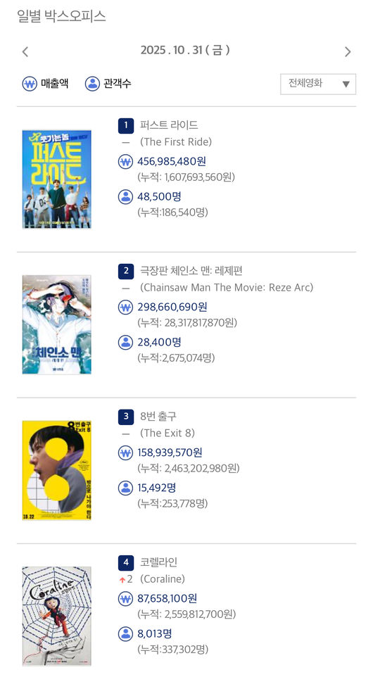 '퍼스트 라이드'가 영화관 입장권 통합전산망 기준 개봉 3일째인 10월 31일(금) 전체 영화 박스오피스 1위를 수성, '극장판 체인소 맨: 레제편'을 제치고 개봉 후 3일 연속 전체 영화 박스오피스 1위를 기록하고 있다. '퍼스트 라이드'가 다가오는 주말을 앞두고 극장가의 새로운 주인공으로 등극해 뜨거운 입소문을 타기 시작했다.