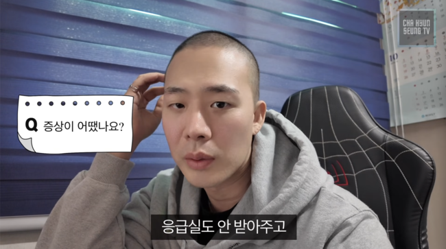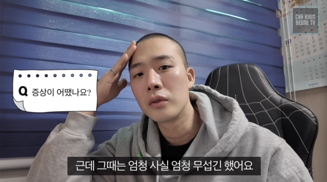 이날 차현승은 “어제 항암을 하고 와가지고 속도 너무 울렁거리고, 먹을 것도 안들어가고 두통도 심하다. 일단 지난번에 물어봤던 그런 질문을 답해드리려고 카메라를 켰다”고 입을 열었다.