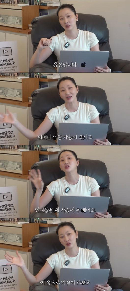 그러면서 장윤주는 “저희 집안이 원래 어머니가 가슴이 좀 크시고, 저희가 딸 셋에 제가 막내인데 언니들은 제 가슴에 두 배다. 약간 살짝 ‘어떡해’ 이 정도로 가슴이 크시다. 제가 제일 작다. 유전이다. 제 거고, 저도 가슴 처진 것 떄문에 고민이 많다"라고 설명했다.