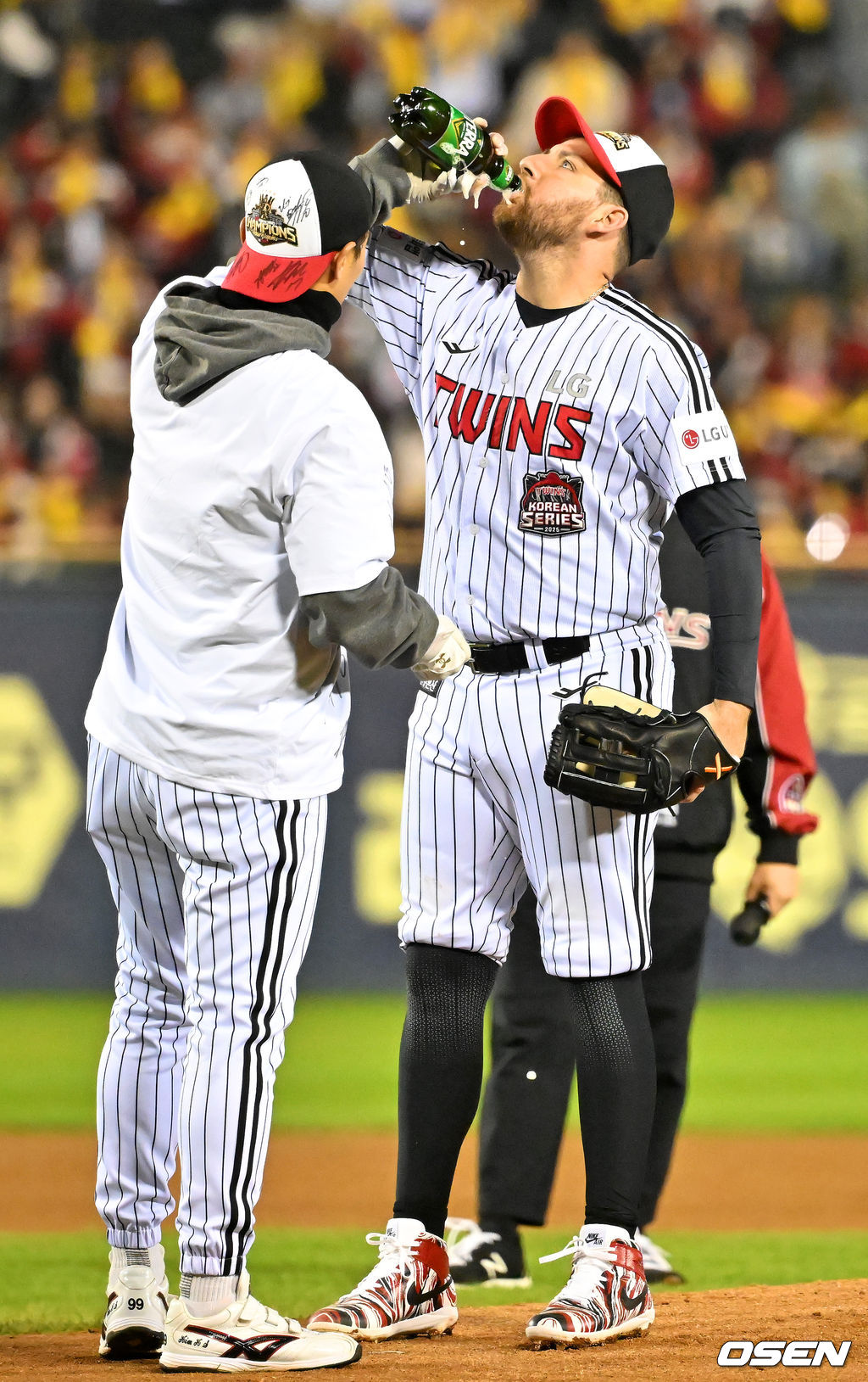 팬들을 위한 이벤트 경기에서 투수로 나선 LG 오스틴이 마운드 위에서 김광삼 투수코치에게 맥주를 받아 마시고 있다. 2025.11.01 / rumi@osen.co.kr