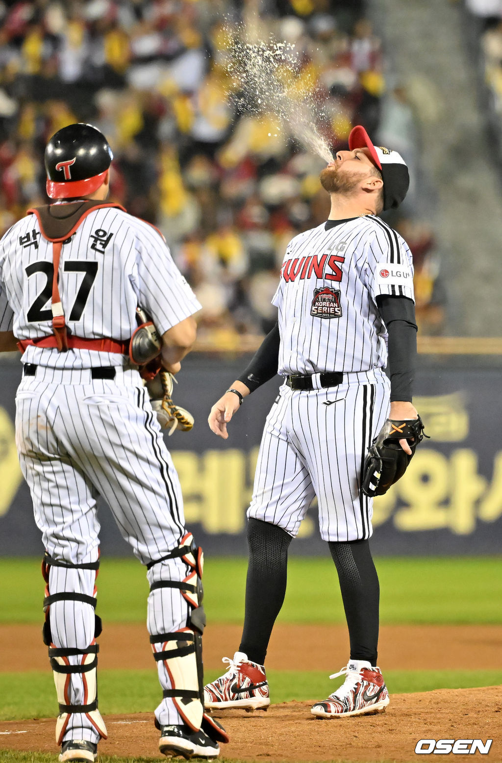 팬들을 위한 이벤트 경기에서 투수로 나선 LG 오스틴이 마운드 위에서 김광삼 투수코치에게 맥주를 받아 마신 후 맥주를 뿜고 있다. 2025.11.01 / rumi@osen.co.kr