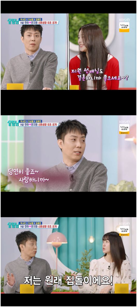 이에 나현은 "은지원 선배님은 결혼하셔서 좋냐"라고 물었다. 김종민이 결혼을 한 이후 대화할 사람이 생겼다며, 너무나 행복하다며 기쁜 얼굴로 말했기에 궁금했던 것이었다. 이에 은지원은 “좋죠. 사랑하니까 결혼을 했고”라며 말하더니 “김종민 이야기를 들어보니까 생활 패턴이 아예 바뀌었다더라. 빨리 집을 가려고 하고 그런다더라”라고 말했다. 그러면서 은지원은 “난 원래 집돌이어서 아내랑 같이 있다”라며 아내와 함께 있는 시간이 기쁘다고 말했다.