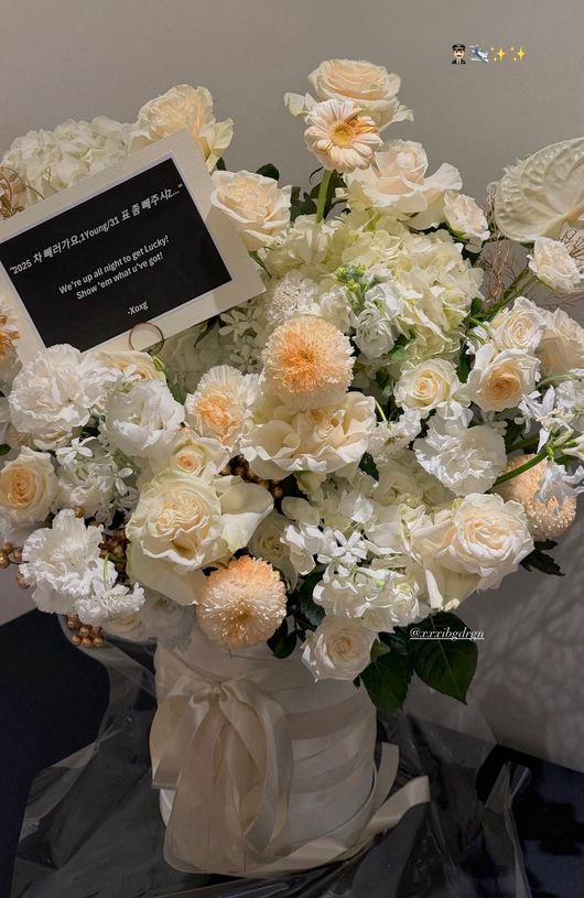 해당 사진에는 순백색의 꽃이 한가득 담긴 화려한 화분 장식이 담겼다. 이와 함께 "2025 차 빼러 가요, 1Young/31 표 좀 빼주시Z..."라고 적힌 작은 쪽지가 담겨 있어 눈길을 끈다.