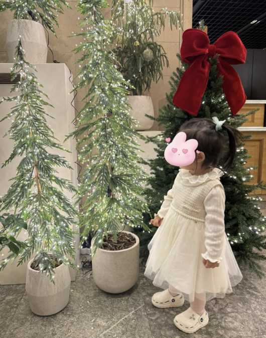 공개된 사진 속에는 하얀 원피스를 입은 서이가 크리스마스트리 옆에서 포즈를 취하고 있다. 반짝이는 조명과 붉은 리본 장식이 어우러진 트리 앞에서 사랑스럽게 서 있는 모습이 시선을 사로잡는다. 이민정은 딸의 얼굴을 스티커로 가렸지만, 작은 체구와 사랑스러운 분위기만으로도 ‘엄마 닮은 미모 유전자’를 느끼게 했다.