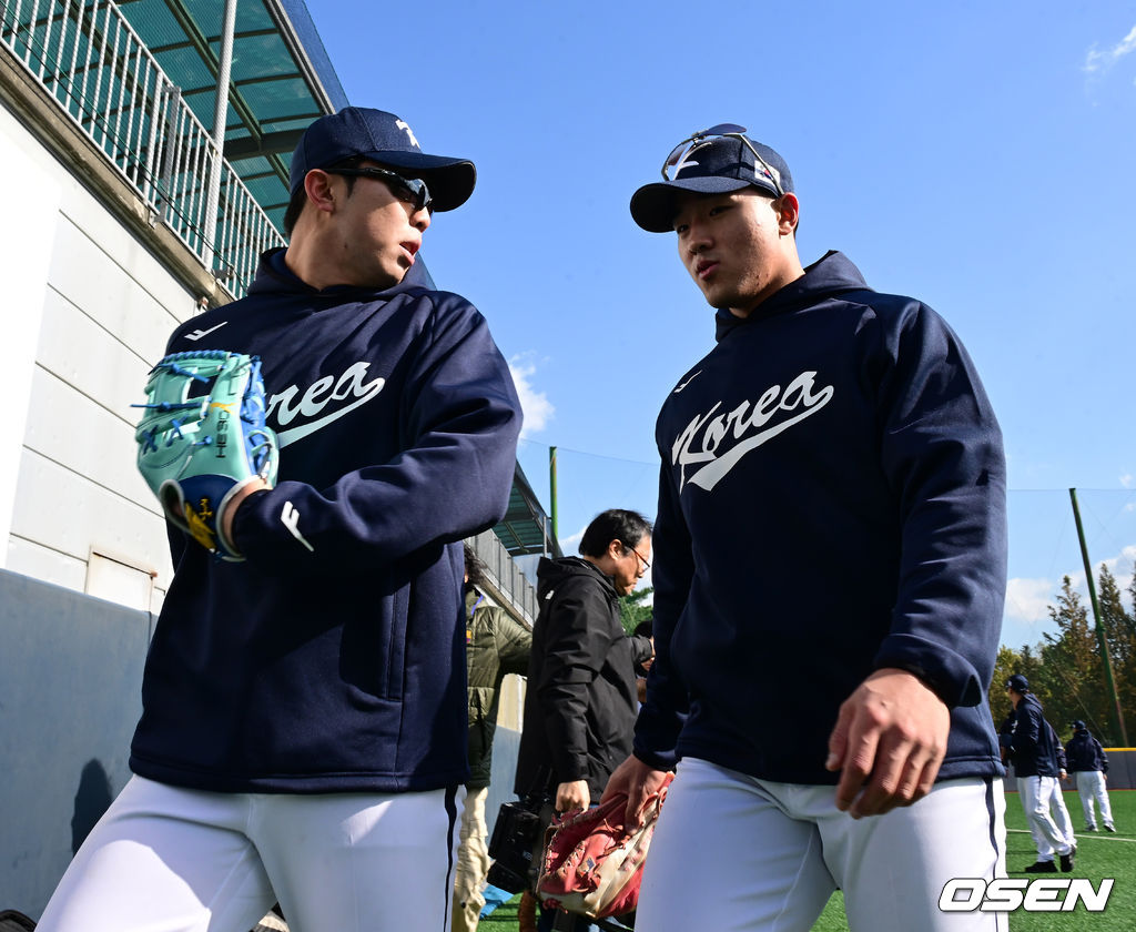 야구대표팀 김영웅, 안현민이 훈련을 준비하고 있다. 2025.11.02 /jpnews@osen.co.kr