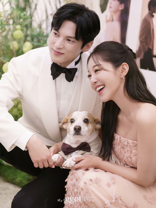 공개된 사진 속에는 윤선우와 김가은의 결혼식 현장이 담겨있어 눈길을 끈다. 턱시도와 웨딩드레스를 입은 두 사람은 결혼 반지를 낀 손을 자랑하는 포즈를 취하며 훈훈한 비주얼을 자랑했다.