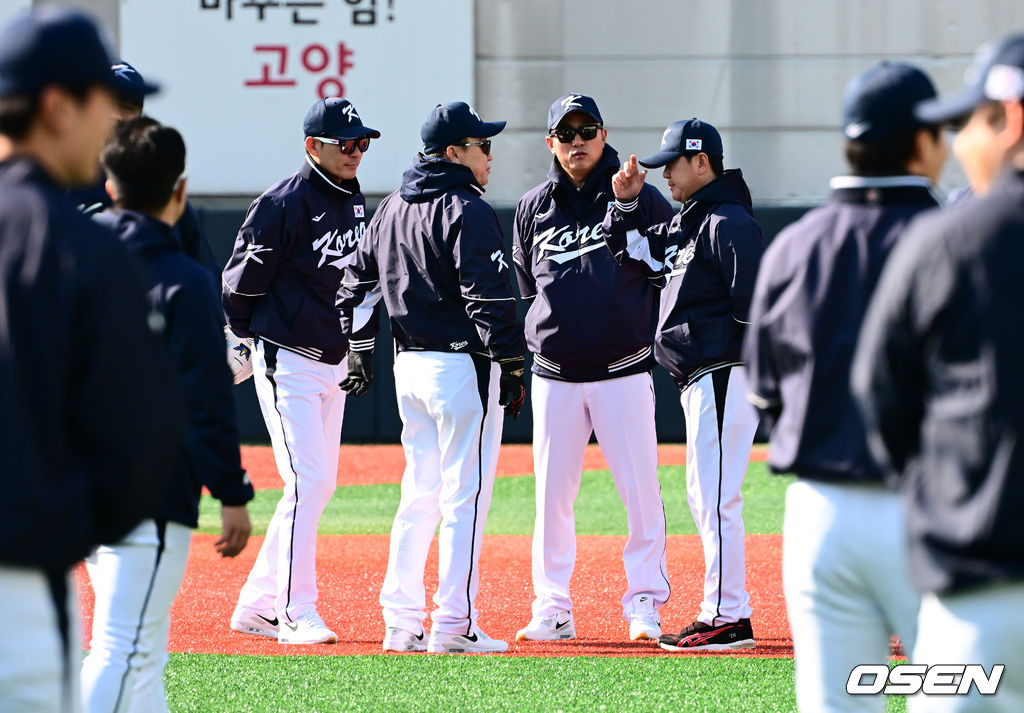 야구대표팀 류지현 감독을 비롯해 강인권, 이동욱, 최원호 코치가 훈련을 지켜보고 있다. 2025.11.02 /jpnews@osen.co.kr