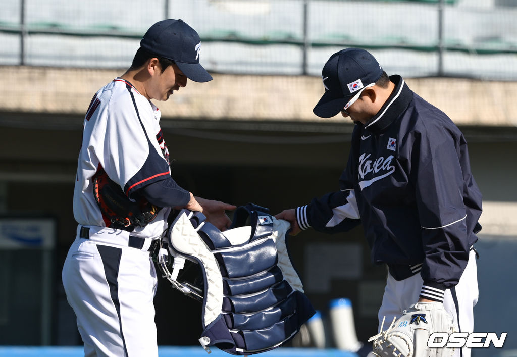 야구 대표팀 조형우가 보호장구를 확인하고 있다. 2025.11.03 /cej@osen.co.kr
