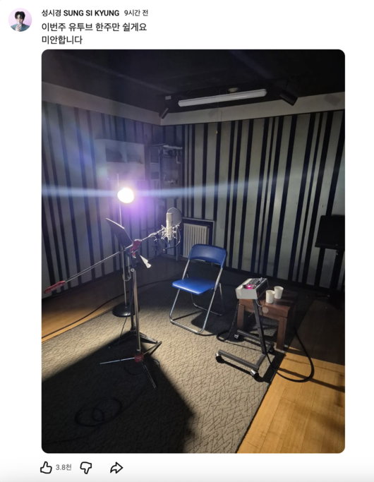 4일 성시경은 유튜브 채널 커뮤니티를 통해 “이번주 유튜브 한주만 쉴게요. 미안합니다”라는 글을 남겼다.