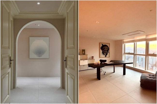 특히 ‘감각적인 아트워크와 조유리 특유의 미니멀한 가구 배치가 눈길을 끈다. 거실에는 오렌지빛 라운지 체어가 포인트로 자리 잡았으며, 주방은 대리석 상판과 화이트 톤 가구로 꾸며져 호텔 라운지 같은 세련미를 더했다.
