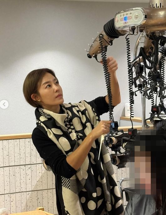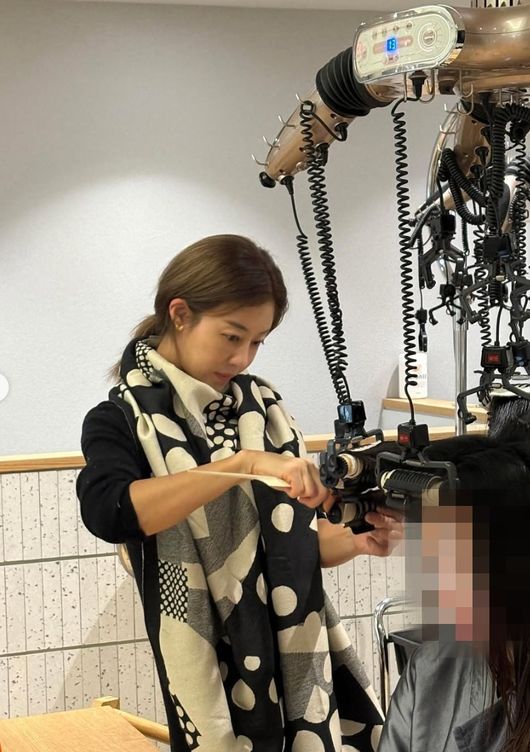함께 공개한 사진들에서는 진지한 표정으로 미용 기구를 만지며 지인의 머리를 해 주고 있는 이지현의 모습이 담겼다.