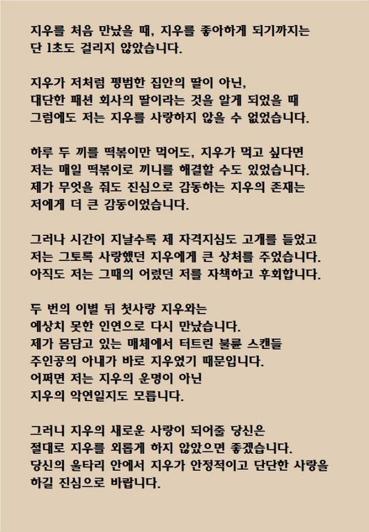 이런 가운데 서지우의 X가 쓴 서지우 소개서에는 함께 사랑을 나눴던 그때 그 시절의 감정이 그대로 녹아 있어 보는 이들의 감성을 자극한다. 사랑을 시작하게 된 계기부터 이별의 원인과 재회의 전말까지 디테일하게 서술한 문장들은 서지우의 연애 시절을 자연스럽게 연상케 하고 있다.