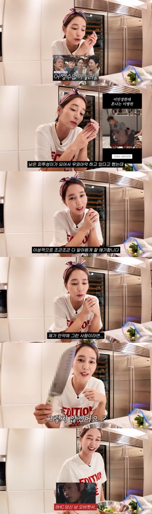 또한 이민정은 "난 화를 낼때도 이성적으로 조곤조곤 잘 알아듣게 얘기한다. 내가 만약 그런 사람이라면 어떻게 나랑 살겠냐? 그죠?"라며 갑자기 부엌칼을 들어 웃음을 자아냈다.