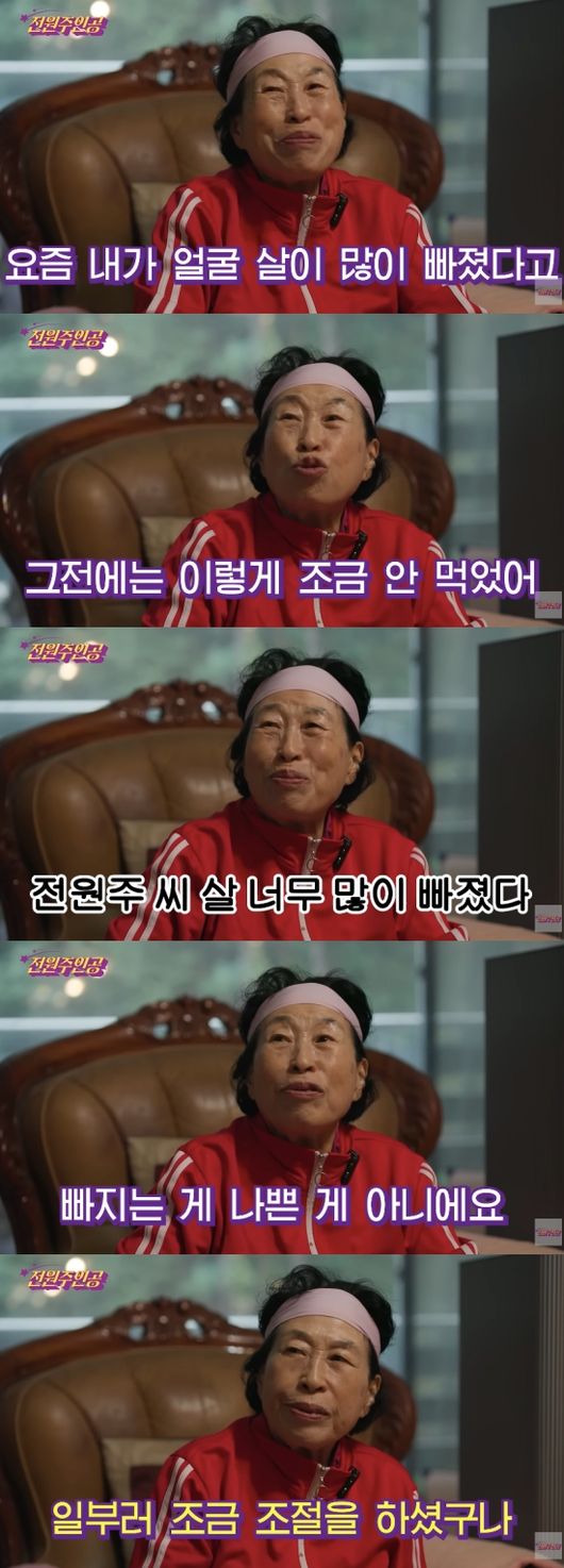 전원주는 “요즘 내가 얼굴살이 많이 빠졌다고 한다. 내가 소식하기 때문이다. 그전에는 이렇게 조금 안 먹었다. 근데 나이가 들면 위장을 너무 부담을 주면 안 된다고 하더라”라고 말했다.