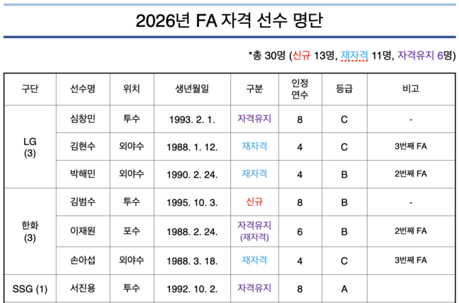 KBO는 5일 2026년 FA 자격 선수 명단을 공시했다. 2026년 FA 자격 선수는 총 30명이다. 이 중 처음 FA 자격을 얻은 선수가 13명, 재자격 선수는 11명, 이미 FA 자격을 취득했지만 FA 승인 신청을 하지 않고 자격을 유지한 선수는 6명이다.