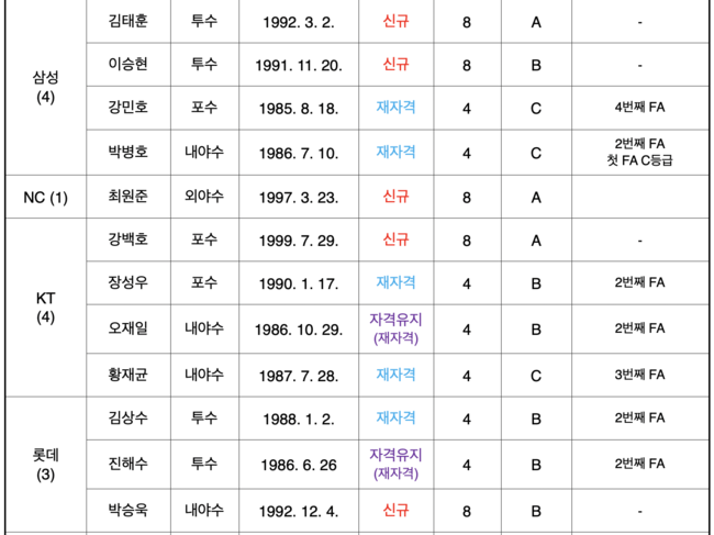 FA 등급별로는 A등급 7명(서진용, 김태훈, 외야수 최원준, 강백호, 조상우, 박찬호, 투수 최원준), B등급 13명(박해민, 김범수, 이재원, 이승현, 장성우, 오재일, 김상수, 진해수, 박승욱, 이준영, 이영하, 김재환, 조수행), C등급 10명(심창민, 김현수, 손아섭, 강민호, 박병호, 황재균, 양현종, 한승택, 최형우, 이용규)이다.