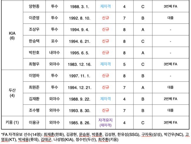 또한 비FA 다년 계약 체결 선수 및 기존 FA 선수 중 계약 기간 연장 옵션 발동 등으로 FA 자격 요건을 신규 취득 또는 재취득했으나 올해 계약 기간이 종료되지 않은 ‘FA 계약 유보 선수’ 14명도 함께 공시했다.