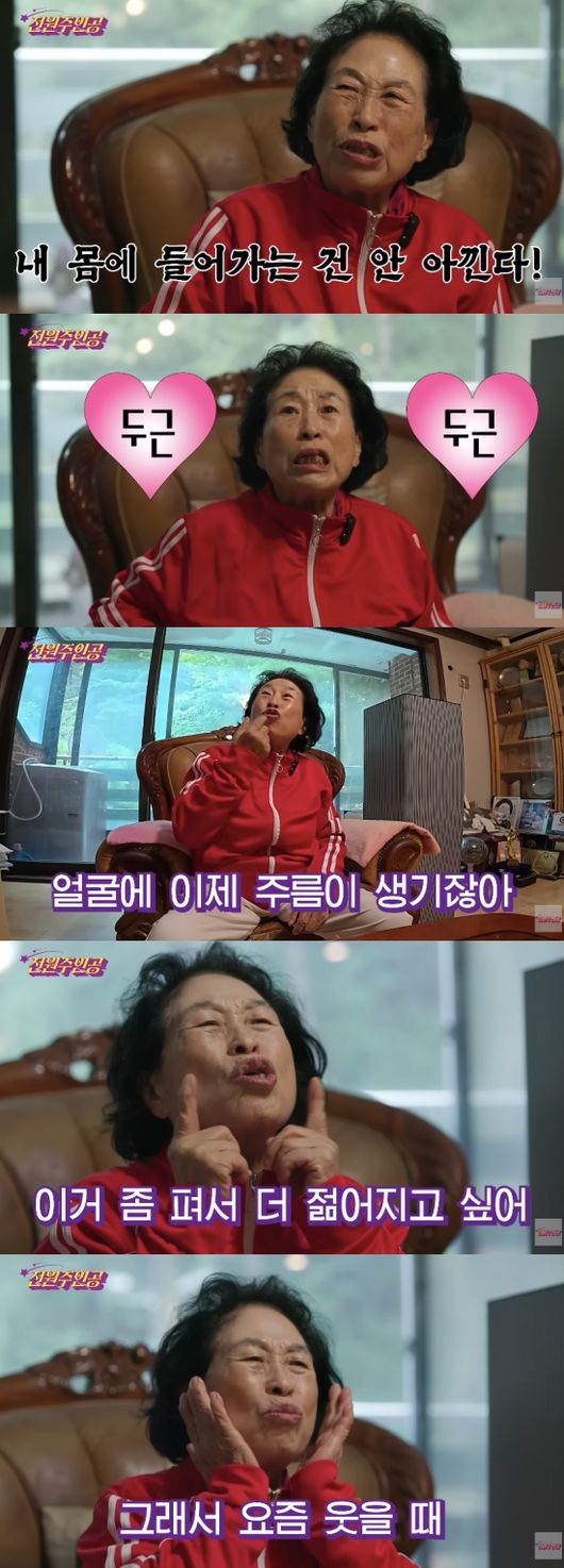 전원주는 “내가 한 가지 흠은 얼굴에 주름이 생기지 않냐. 이것 좀 펴서 더 젊어지고 싶다. 밤낮으로 웃으니까 주름이 생긴다. 지금은 주름 안 생기게 잡고 웃는다”라고 고민을 털어놨다.