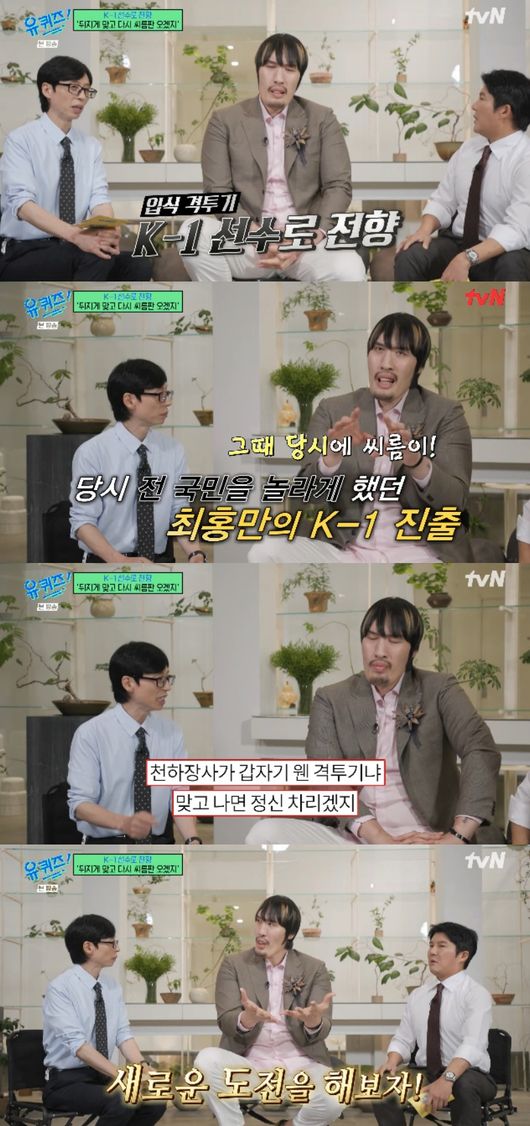 5일 방송된 tvN 예능 ‘유 퀴즈 온 더 블럭’(이하 ‘유퀴즈’)에서는 ‘끝없는 사투’ 특집으로 이종격투기 선수 최홍만이 등장했다.