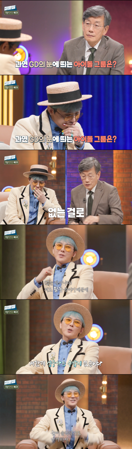 이어 손석희가 "그중에 눈이 가는 그룹이 있느냐"고 묻자, 지드래곤은 선뜻 답을 하지 못하고 오랫동안 고민하는 모습을 보였다. 이에 손석희는 "없는 걸로"라고 말해 웃음을 자아냈다.
