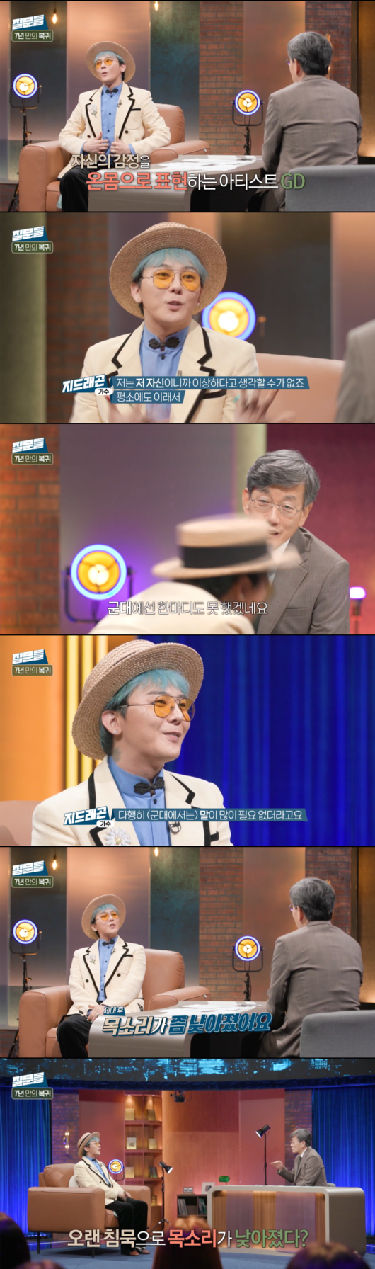 또한, 지드래곤은 군 복무를 마친 후 변화도 언급했다. 그는 "(제대 후) 목소리가 좀 낮아졌다"며 군 전역 후에 목소리 톤이 변한 것 같다고 말했다. 원래는 목소리 톤이 훨씬 미성으로 말했던 것 같다고 설명했다.
