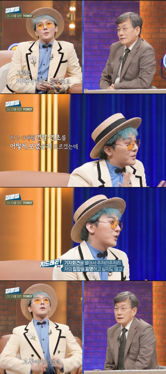 당시의 고통에 대해 지드래곤은 *그 당사자임에도 불구하고 말할 곳이 없었다"고 토로했다. 손석희가 "분명한 피해자임에도 불구하고"라고 공감하자, 지드래곤은 "억울하고 하소연하고 싶은 게 아님에도 일이 점점 걷잡을 수 없이 커졌다"고 답답함을 호소했다.